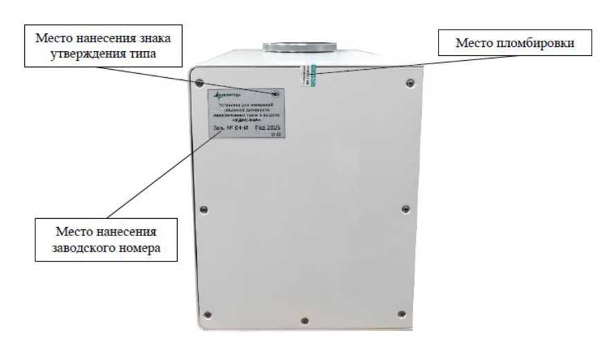 Для пломбирования используются стикер-наклейки на корпусе установки. Общий вид установки с указанием мест пломбировки от несанкционированного доступа, мест нанесения знака утверждения типа и заводского номера представлен на рисунках 1 и 2.