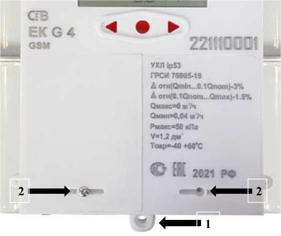 Заводской номер наносится на маркировочную табличку отсчетного устройства методом термопечати. Пломбировку от несанкционированного доступа осуществляют нанесением знака поверки давлением клейма на свинцовую (пластмассовую) пломбу, закрепленную с помощью проволоки или пластмассовой разрушаемой клипсы, или на специальную мастику в чашке винта крепления.