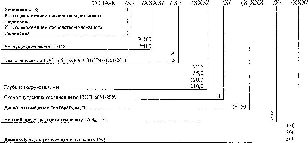 Исполнения комплектов ТСПА-К различаются номинальной статической характеристикой преобразования (далее - НСХ), классом допуска, глубиной погружения, диаметром и конструкцией защитной арматуры.