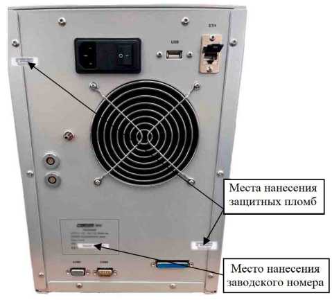 Пломбирование задней панели генератора осуществляется двумя стикер-наклейками (рисунок 3). Заводской номер генератора базовой модификации наносится на табличку на задней панели прибора методом лазерной гравировки. Заводские номера контрольных гигрометров модификаций Humiwell-473, Humiwell-S8000 и Humiwell-2201 наносятся на таблички на задних панелях приборов диффузионным способом. Знак поверки наносится на свидетельство о поверке и/или в формуляр прибора. Знак утверждения типа наносится на лицевую панель генератора базовой модификации.