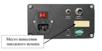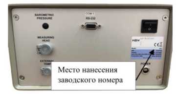 Внешний вид задних панелей генератора влажного газа Humiwell и контрольных гигрометров с указанием мест нанесения защитных пломб и мест нанесения заводских номеров приведен на рисунках 3 и 4.