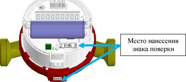 Для счетчиков с заменяемым элементом питания дополнительно пломбировка осуществляется нанесением знака поверки на самоклеящуюся наклейку, устанавливаемую на разъем для калибровки счетчиков внутри батарейного отсека.