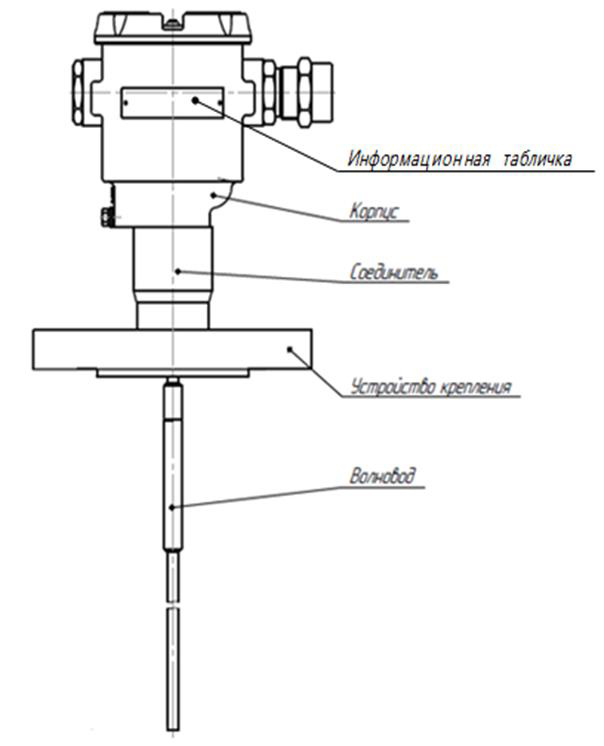 В зависимости от варианта исполнения уровнемера конструкция корпуса, соединителя, устройства крепления и волновода может отличаться от представленной на рисунке 1.