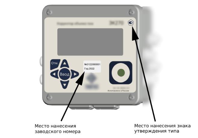 Заводской номер корректоров представляет собой цифровой код, состоящий из арабских цифр. Заводской номер наносится типографским способом на наклейку, размещаемую на лицевой панели корректоров, и записывается в энергонезависимую память корректоров при выпуске из производства. Просмотр заводского номера на жидкокристаллическом дисплее корректоров осуществляется путем вызова соответствующего пункта меню при помощи кнопок управления (согласно эксплуатационным документам). Знак утверждения типа наносится на лицевую панель корректоров методом фотопечати. Места расположения заводского номера и знака утверждения типа указаны на рисунке 2.