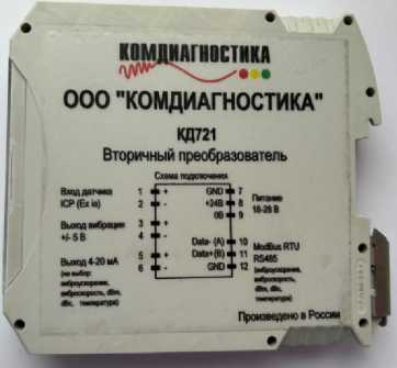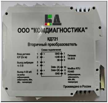 Датчик подключается к вторичному преобразователю через интерфейс ICP и искробезопасный барьер, встроенный в ВП. Вторичный преобразователь передает измерительную информацию по протоколу Modbus-RTU, такую как виброускорение, виброскорость, температура, а также может передавать данные об измерении ударных импульсов в месте крепления датчика.