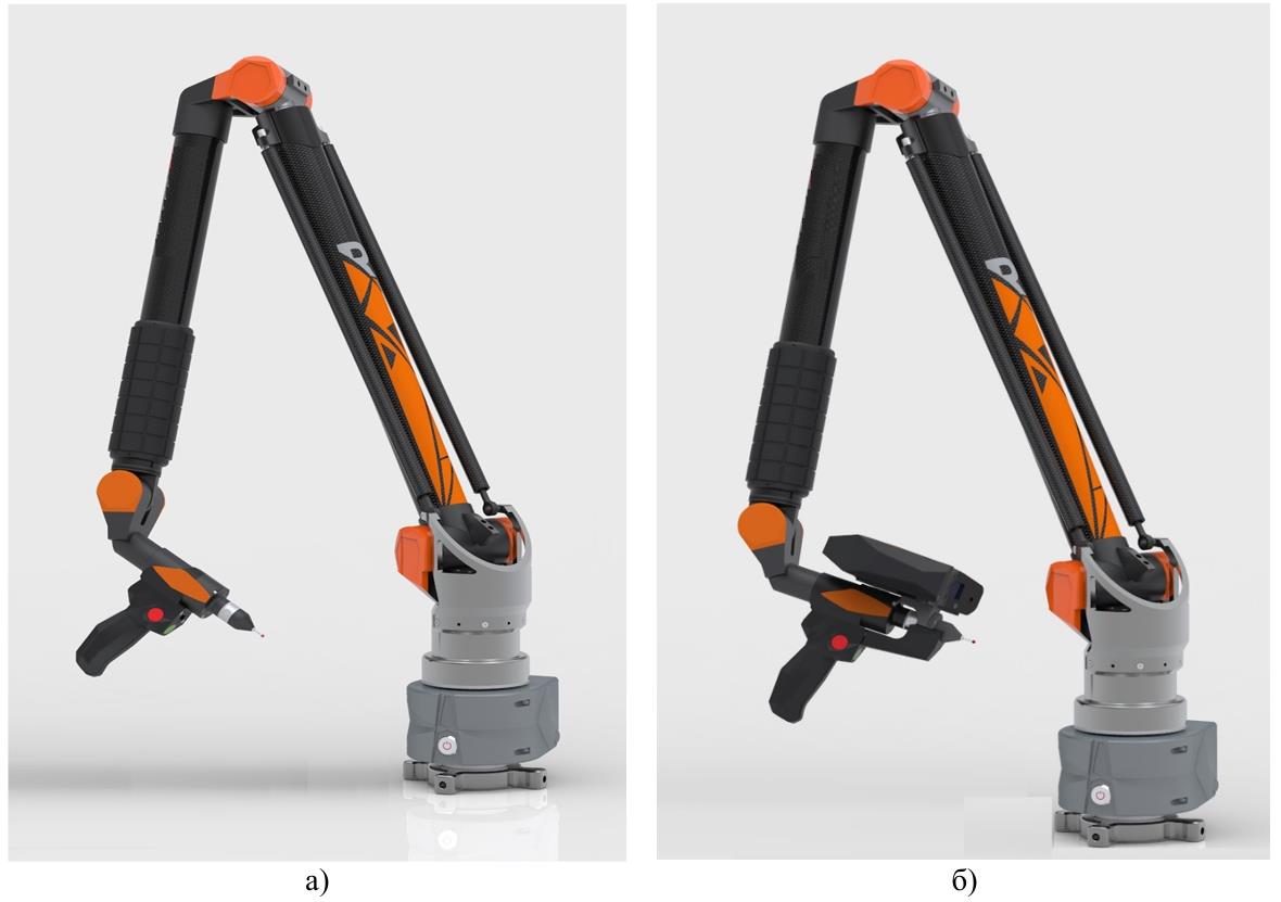Рисунок 1 - Общий вид КИМ с шестью осями вращения с контактным щупом (а), с семью осями вращения с контактным щупом и лазерным сканером ЭВАСКАН, установленным на рукоятку (б)