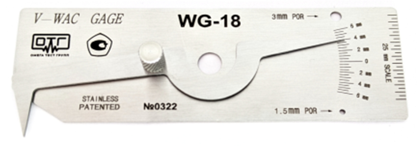 Конструктивно шаблоны сварщика исполнения WG-18 состоят из основной пластины с нанесенными на ней шкалами и движка с измерительным наконечником. На пластине имеются два специальных отверстия для контроля поверхностных пор.
