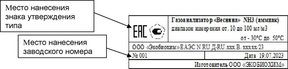 Газоанализаторы имеют заводские номера, обеспечивающие идентификацию каждого экземпляра, которые наносятся типографским способом в виде цифрового обозначения на идентификационную табличку (рисунок 2), наклеенную на МИП. Нанесение знака поверки на газоанализаторы не предусмотрено. Опломбирование от несанкционированного доступа не предусмотрено.