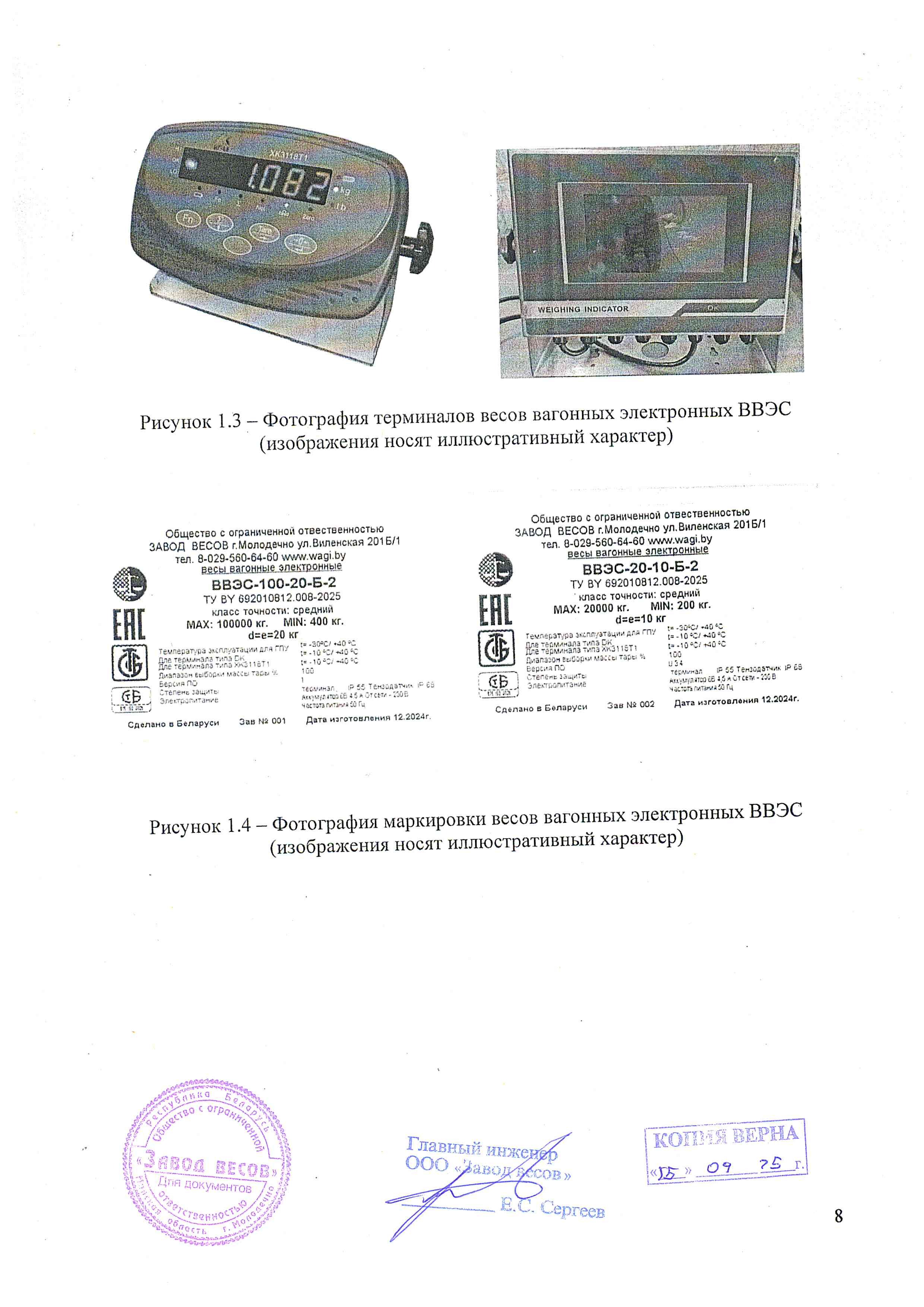 Заключение о соответствии утвержденного типа средств измерений требованиям технических нормативных правовых актов и/или технической документации производителя: весы вагонные электронные ВВЭС соответствуют требованиям Т.У BY 692010812.008-2024, ГОСТ OIML R 76-1-2011, ТР ТС .020/2011, ТР ТС 004/2011.