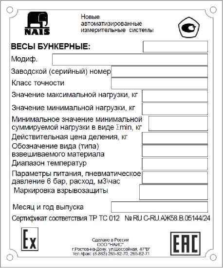 наносится на маркировочную табличку, расположенную на весовом бункере или опорной раме средств измерений, а также типографским способом на титульный лист эксплуатационного документа.