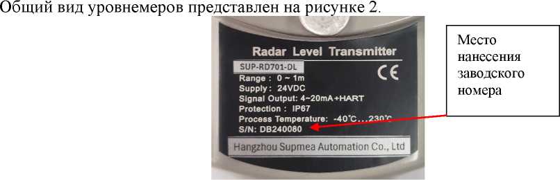 Заводской номер в виде буквенно-цифрового обозначения, состоящего из латинских букв и арабских цифр, наносится методом печати на маркировочную табличку, наклеиваемую на корпус уровнемера. Общий вид (схема) маркировочной таблички представлен на рисунке 1.