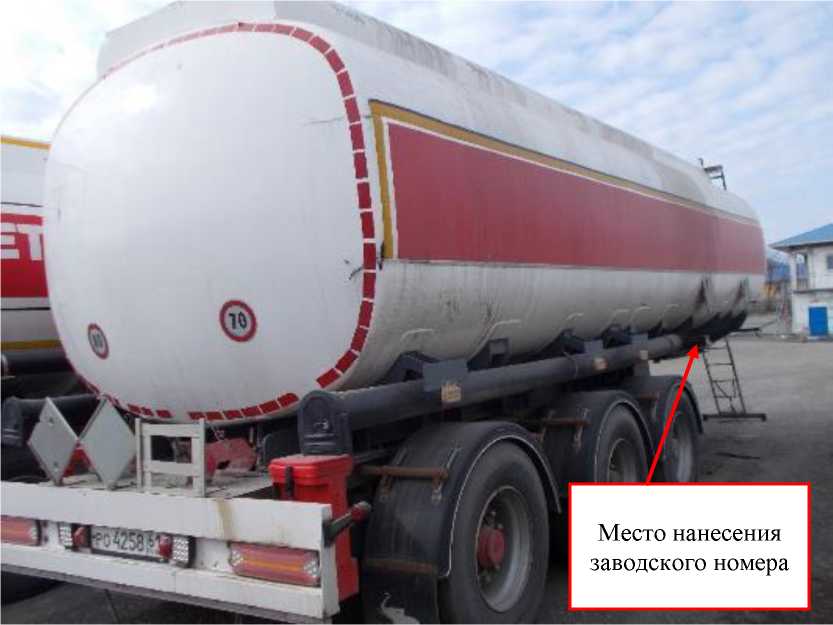 Заводской номер в виде буквенно-цифрового и цифрового обозначения, состоящего из латинских букв и арабских цифр, нанесен типографским способом в паспорт полуприцепов-цистерн и ударным методом на металлическую табличку, закрепленную при помощи заклепок на раме транспортной тележки.