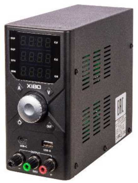 Конструктивно источники выполнены в пластмассовом корпусе настольного исполнения. Индикация установленных значений напряжения и силы постоянного тока осуществляется с помощью дисплея. Установка выходных параметров осуществляются с помощью поворотных переключателей, расположенных на лицевой панели. Источники выпускаются под торговой маркой «XIBO».