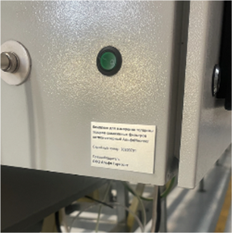 комплекс имеет следующие составляющие части: конструкция рамы комплекса для установки фильтров, колонна сканера с телецентрической оптикой, предназначенной для получения оптических снимков щелевых зазоров, лазерный дальномер для оптической фокусировки, промышленная подсветка для сканера, система горизонтального перемещения колонны сканера, система вертикального перемещения оптического сканера, система вращения фильтра, системный блок управления инспекционным комплексом с управляющим модулем и парковочная зона колонны сканера. Управление работой комплекса строится через графический интерфейс сенсорного экрана системного блока. Изображение с сенсора сканера поступает в управляющий модуль для дальнейшей обработки. На основе математических алгоритмов и данных внешней и внутренней калибровки системы делается расчет по величинам щелевых зазоров тестируемой поверхности фильтра. Данные по этим расчетам выводятся на дисплей вычислительной системы в режиме реального времени
