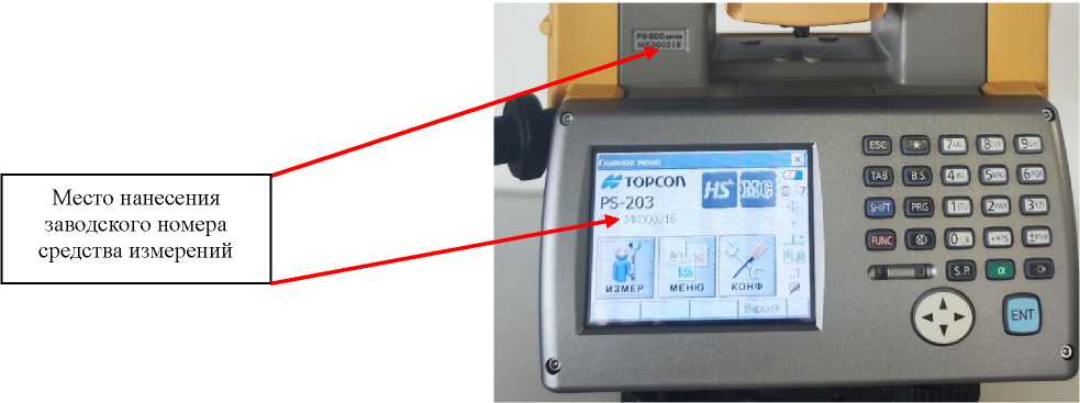 Заводской номер тахеометра в виде буквенно-цифрового обозначения, состоящего из букв латинского алфавита и арабских цифр, указывается типографским способом на маркировочной наклейке, расположенной на лицевой стороне тахеометра и отображается вместе с модификацией в главном меню встроенного программного обеспечения BASIC.