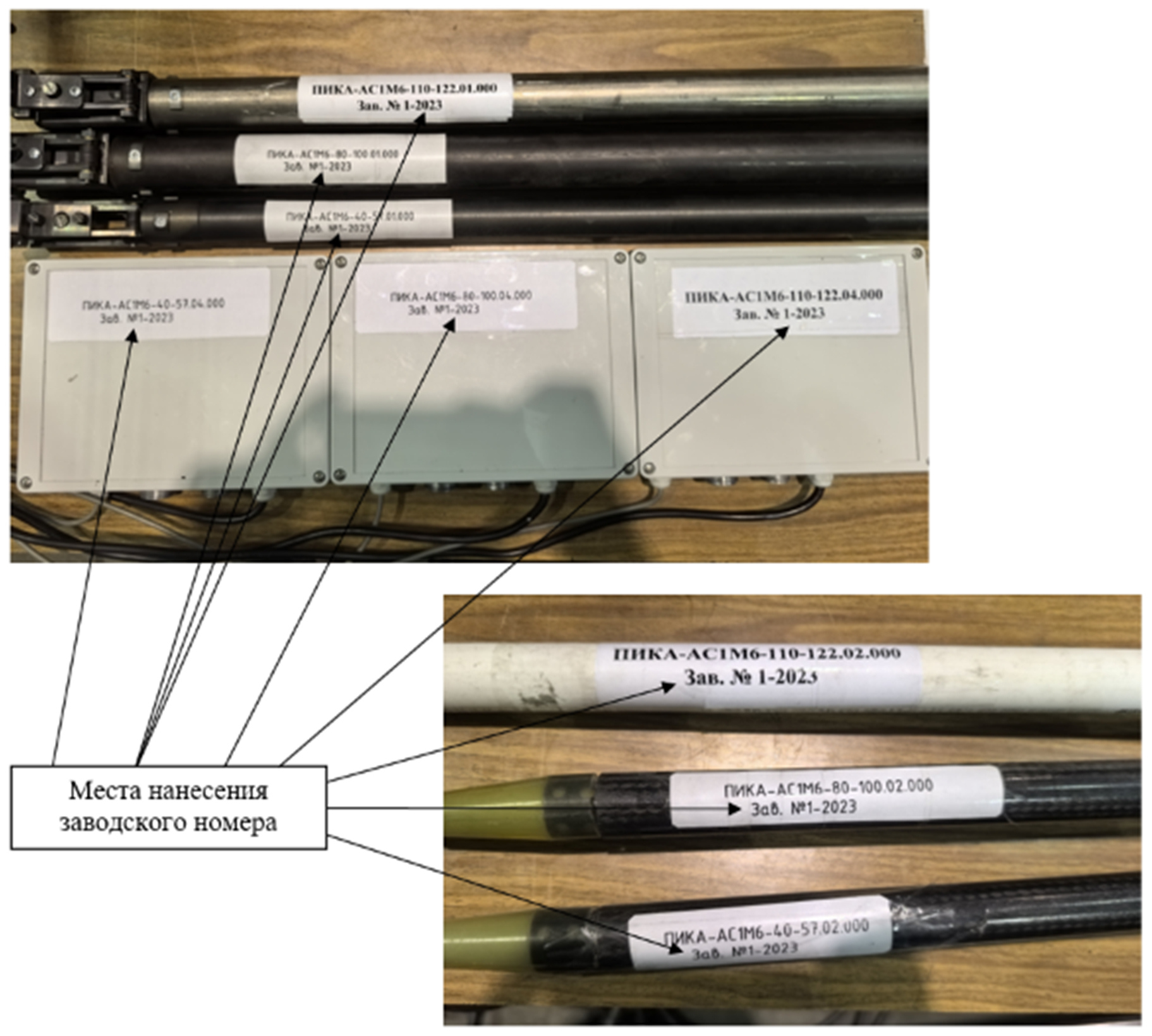 Заводской номер наносится методом типографской печати на наклейку в цифровом формате. Наклейка, содержащая обозначение и заводской номер, наносится на каждый комплектующий элемент прибора. Места нанесения заводского номера представлены на рисунке 2.