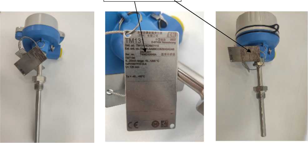 Нанесение знака поверки на датчики не предусмотрено. Заводской номер, обеспечивающий идентификацию каждого экземпляра средства измерений, состоящий из букв латинского алфавита и арабских цифр, наносится методом лазерной гравировки на металлический шильдик, прикрепленный к коммутационной головке, и указывается на маркировочной табличке (этикетке), прикрепленной к конструкции датчиков.