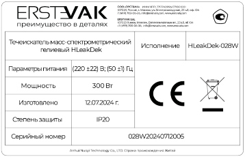 Серийный номер течеискателя наносится в виде буквенно-цифрового обозначения способом цифровой печати на маркировочную табличку течеискателя, расположенную на боковой панели корпуса течеискателя.