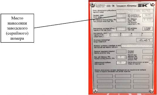 Заводской (серийный) номер в виде цифрового обозначения, состоящий из трех или четырех арабских цифр, нанесен ударным методом на информационную табличку, общий вид которой представлен на рисунке 3. Информационная табличка расположена с левой стороны по ходу движения в передней части АЦ и АТЗ, в месте указанном на рисунке 2.