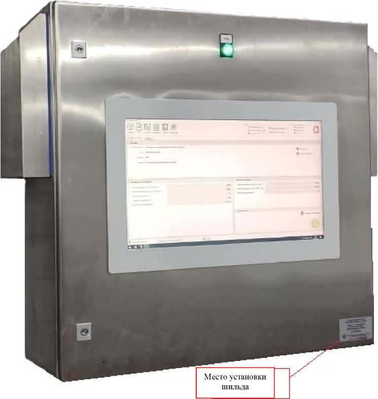 Знак утверждения типа наносится в левом нижнем углу шильда, закрепляемого справа внизу на внешней стороне дверцы модуля измерительного (рисунок 2), заводской номер, состоящий из 6 цифр, наносится в правом нижнем углу шильда.