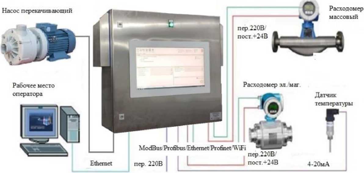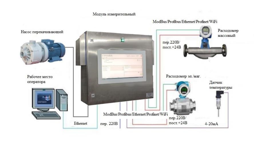 Для систем Б выбор типа расходомера определяется свойствами измеряемой жидкости и необходимостью контроля ее плотности и температуры. Данные с расходомеров передаются в модуль измерительный по цифровым протоколам Modbus, Profibus, Profinet, Ethernet или аналоговым сигналам.