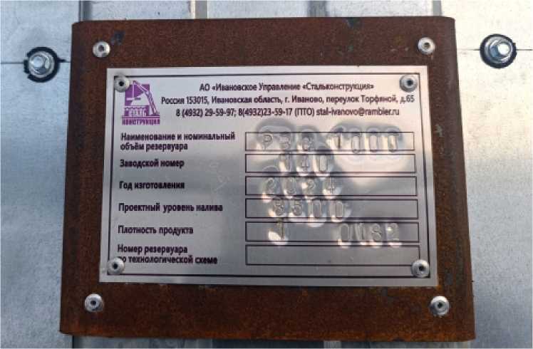 Заводской номер резервуара в виде цифрового обозначения, состоящий из арабских цифр, нанесен ударным способом на маркировочную табличку резервуара (рисунок 1). Табличка крепится на обшивку резервуара.
