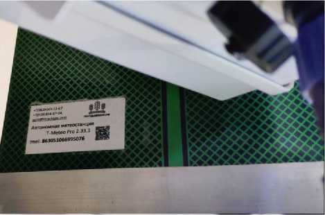 Нанесение знака поверки непосредственно на станции не предусмотрено. Заводской номер, состоящий из пятнадцати арабских цифр, наносится на корпус солнечной панели с обратной стороны или на корпус телеметрического блока в виде наклейки. Вариант нанесения заводского номера на корпус солнечной панели станции представлен на рисунке 2. Пломбирование корпуса производят круглыми пластиковыми либо бумажными пломбами.