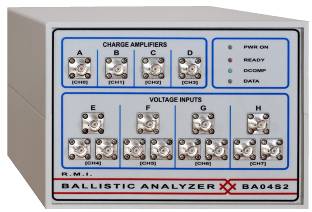 Баллистический анализатор BA04S2 предназначен для обработки поступающих на него сигналов с датчиков давления и оптических барьеров. При поступлении сигнала «старт» запускается внутренний таймер баллистического анализатора, сигнал «стоп» останавливает таймер. Скорость метаемого элемента обратно пропорциональна времени между сигналами «старт» «стоп».