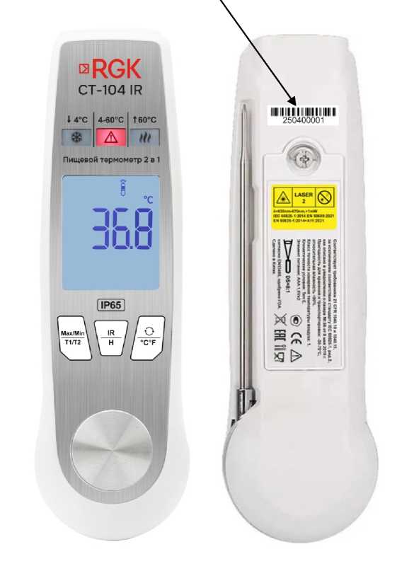 Рисунок 1 - Общий вид термометров пищевых RGK CT-104 IR с указанием места нанесения заводского номера