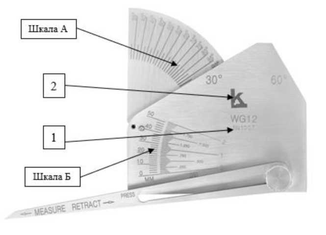 - WG-12 - для измерения параметров угловых и тавровых соединений, сваренных под углом больше или меньше 90°. Конструктивно шаблоны сварщика модели WG-12 состоят из двух пластин с измерительными шкалами, и стопорного устройства;