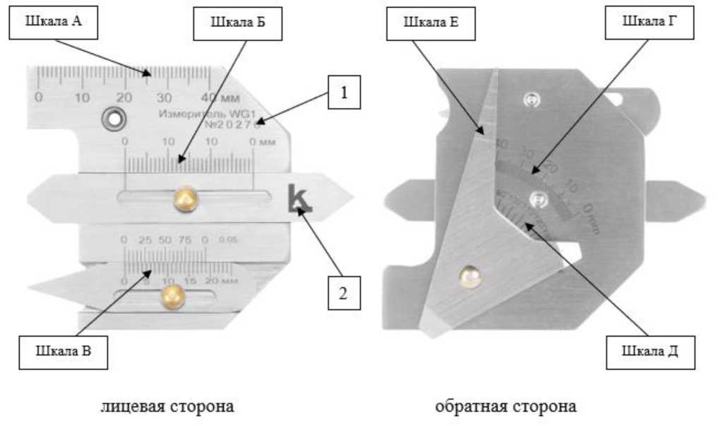 - WG-2+ - для измерения смещения, угла разделки кромки, величины зазора, угла раскрытия Х-шва, высоты шва, размеров углового шва, ширины шва, глубины подреза, дефектов сварного шва. Конструктивно выполнен на основе шаблона сварщика модели WG-1, но имеет увеличенный диапазон шкал «Г» и «Д» (смещение кромок, высота выпуклостей, высота углового шва, высота стыкового шва, ширина шва, угол разделки кромок) и габаритные размеры;