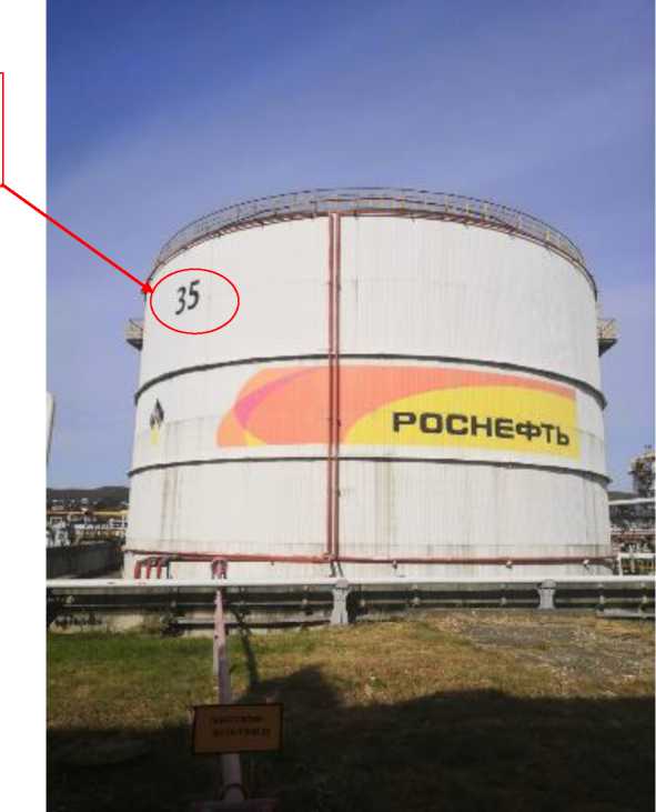 Фотография общего вида резервуара вертикального стального цилиндрического РВС-10000 с обозначением заводского № 35, нанесенного на внешнюю стенку резервуара методом окрашивания краской через трафарет, представлена на рисунке 1.