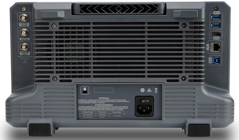На передней панели осциллографов расположены: емкостный сенсорный ЖК-дисплей, входы аналоговых каналов, вход цифрового логического анализатора, два выхода функционального генератора сигнала (опция), разъем USB 3.0 для подключения внешних накопителей и регуляторы управления и установки параметров.