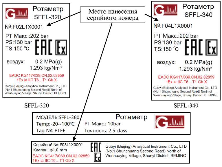 Серийный номер ротаметров, состоящий из арабских цифр и букв латинского алфавита, наносится на маркировочную табличку ротаметров методом лазерной гравировки. Конструкцией ротаметров не предусмотрено нанесение знака поверки и пломбирование.