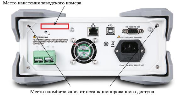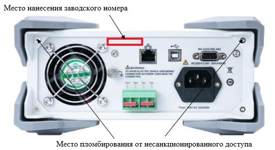 Рисунок 3 - Место нанесения заводского номера и место пломбирования от несанкционированного доступа источников АКИП-1193/1