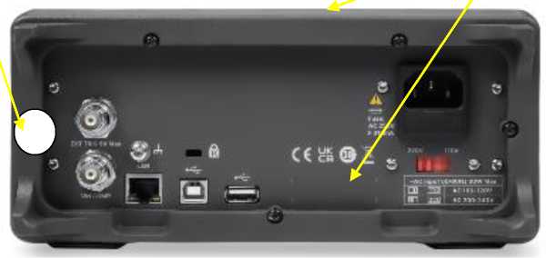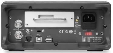 На задней панели расположены: гнездо для подключения сетевого шнура питания, сетевой предохранитель, интерфейсы дистанционного управления (USB, LAN), разъемы входа и выхода синхронизации VMC, выход сканера (при наличии опции 16-канальнго сканера SC1016).
