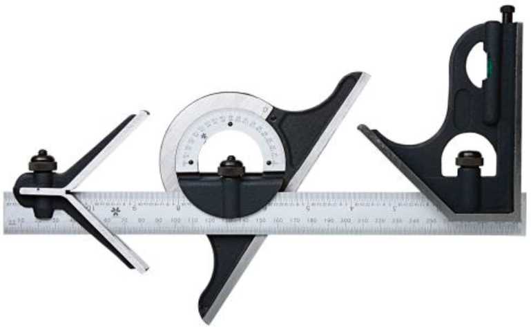 - 8124 - для измерений плоских углов, длины и высоты, определения центра круглых заготовок, для разметки. Есть возможность установки лезвия под углом 90° или 45° к краю заготовки. Состоят из диска с нанесенной на нем угловой шкалой, съемных измерительных линеек различных форм (квадратная и центрирующая), стопорного винта. Измерительные линейки имеют возможность вращаться на 180°.