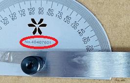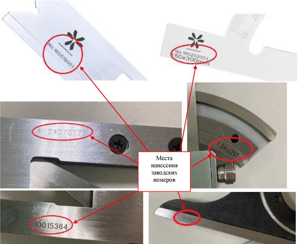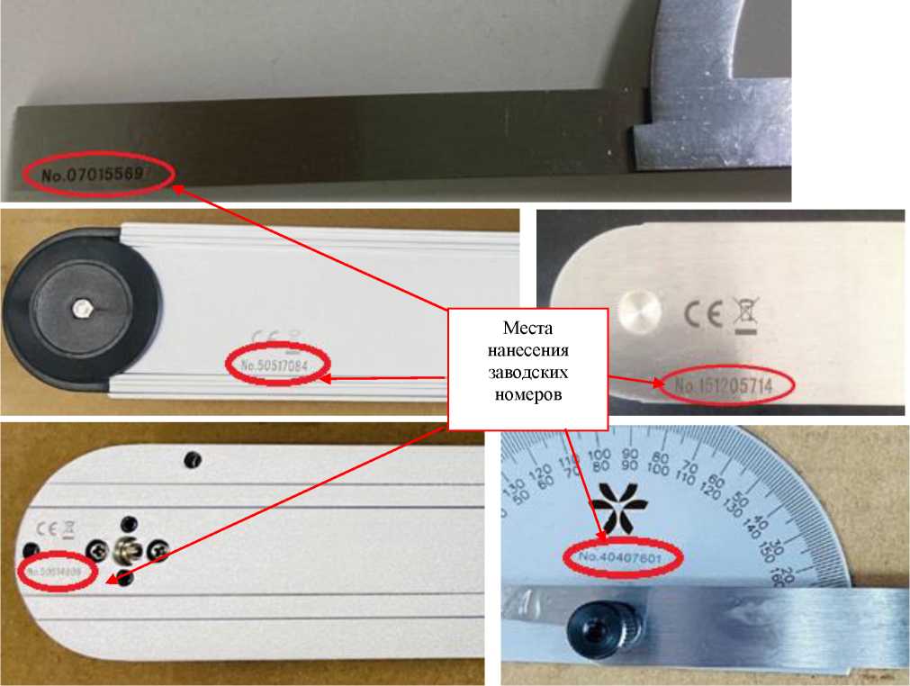 Заводской номер в виде цифрового или буквенно-цифрового обозначения, состоящего из арабских цифр и букв латинского алфавита, наносится на заднюю или переднюю часть угломера, линейку или заднюю часть основания угломера краской или лазерной маркировкой в местах, указанных на рисунках 15 - 16.