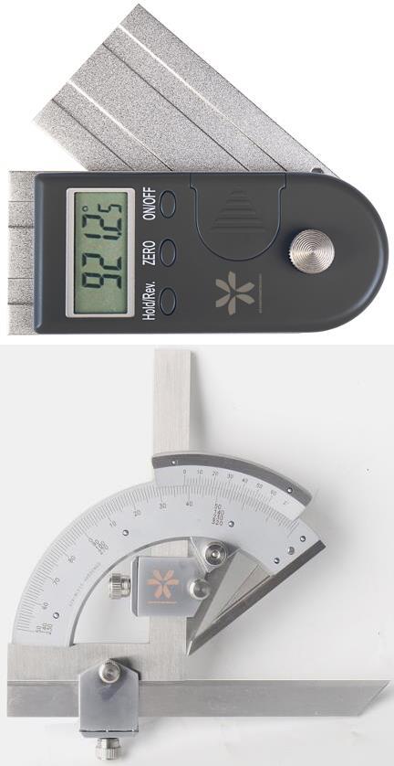 - 8113 - для измерений плоских углов, установки горизонтальных и вертикальных углов скоса режущего станка. Состоят из линейки с алюминиевым основанием, подвижной измерительной линейки из нержавеющей стали и стопорного винта. В основание встроены цифровое отсчетное устройство, продольный и поперечный пузырьковые уровни;