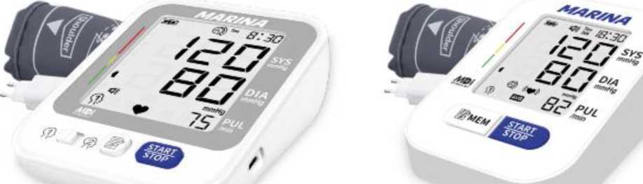 Тонометры автоматические медицинские Marina, в вариантах исполнения (далее - приборы) предназначены для неинвазивного измерения текущей частоты сердечных сокращений, систолического и диастолического артериального давления с помощью автономной программы, которая регулирует автоматическое надувание манжеты на плече/запястье и циклы измерения.