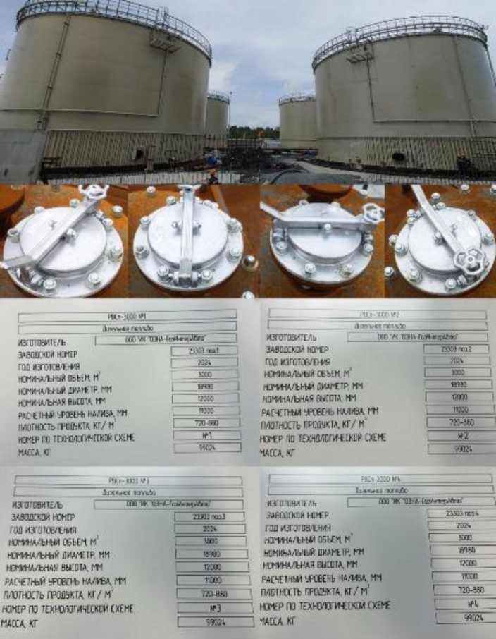 Фотографии общего вида резервуаров вертикальных цилиндрических стальных с понтоном РВСп-3000, горловин замерных люков и заводских номеров представлены на рисунке 1.