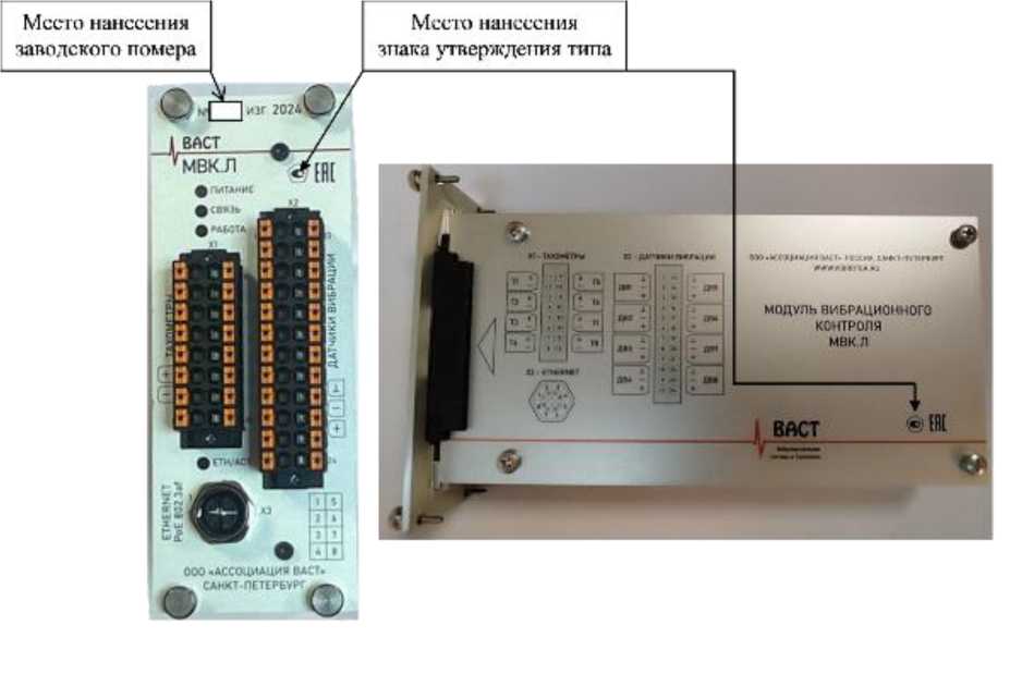Заводские номера в цифровом формате наносятся на лицевые панели модулей МВК.Л методом печати или ударно-точечным методом. Нанесение знака поверки на средство измерений не предусмотрено. Пломбирование модулей МВК.Л не предусмотрено.