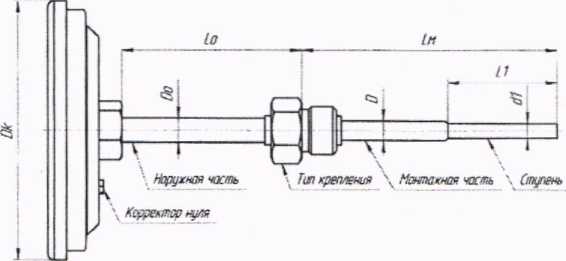 ’) для классов точности: 2,5; 4. 2) для классов точности: 1,5; 2,5; 4. 31 для классов точности: 1; 1,5; 2,5; 4. 4) диапазоны показаний, диапазоны измерений, пределы допускаемой основной приведенной погрешности, указаны в таблице 2. 5) возможно только для термометров с диапазоном показаний до 250 °C. Примечания: 1 При отсутствии крепёжной части значение параметров 13,14,15,16 не указываются. 2 При отсутствии параметры 11, 12, 19,20 не указываются. 3 В накладном исполнении крепёжная часть отсутствует, значение параметров с 9 по 16, 18, 19, и 20 не указываются. 4 Максимальная длина термометра (длина монтажной части, Ьм + длина наружной части, Lq.) не более 1000 мм. | ||