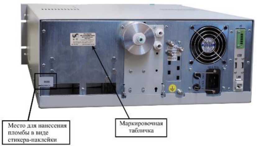 Общий вид анализаторов представлен на рисунке 1. Нанесение знака поверки на анализатор не предусмотрено. Заводской номер, состоящий из арабских цифр, наносится способом термотрансферной печати на маркировочную табличку. Общий вид задней панели анализаторов с указанием места пломбировки и маркировочной таблички приведен на рисунке 2. Пример маркировочной таблички приведен на рисунке 3.
