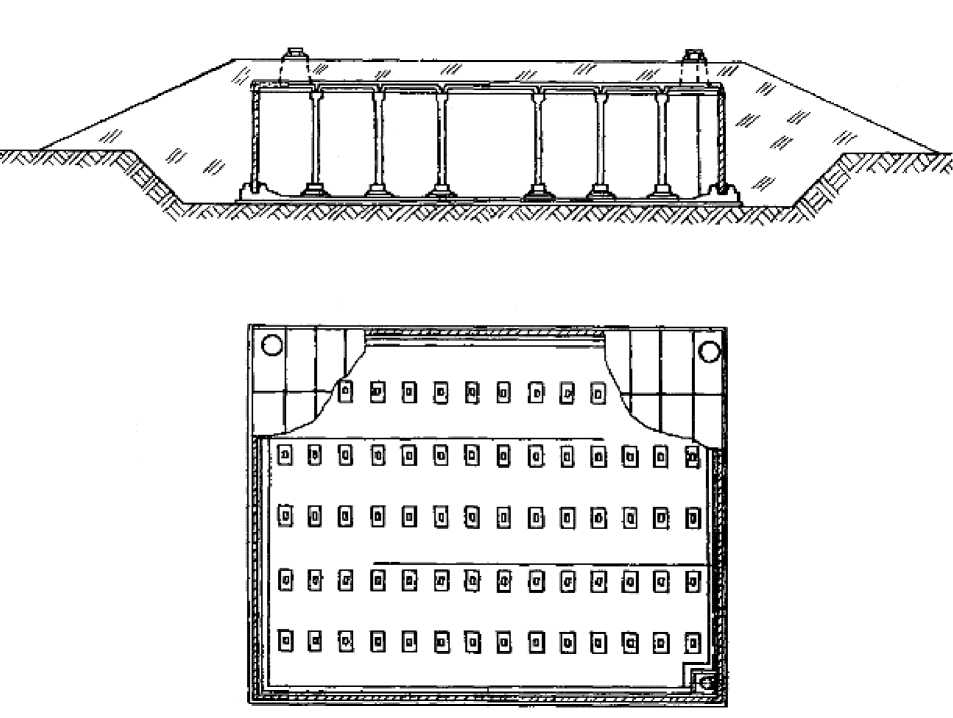 Резервуар представляет собой прямоугольную конструкцию, состоящую из сборной железобетонной стенки, монолитного днища и кровли.