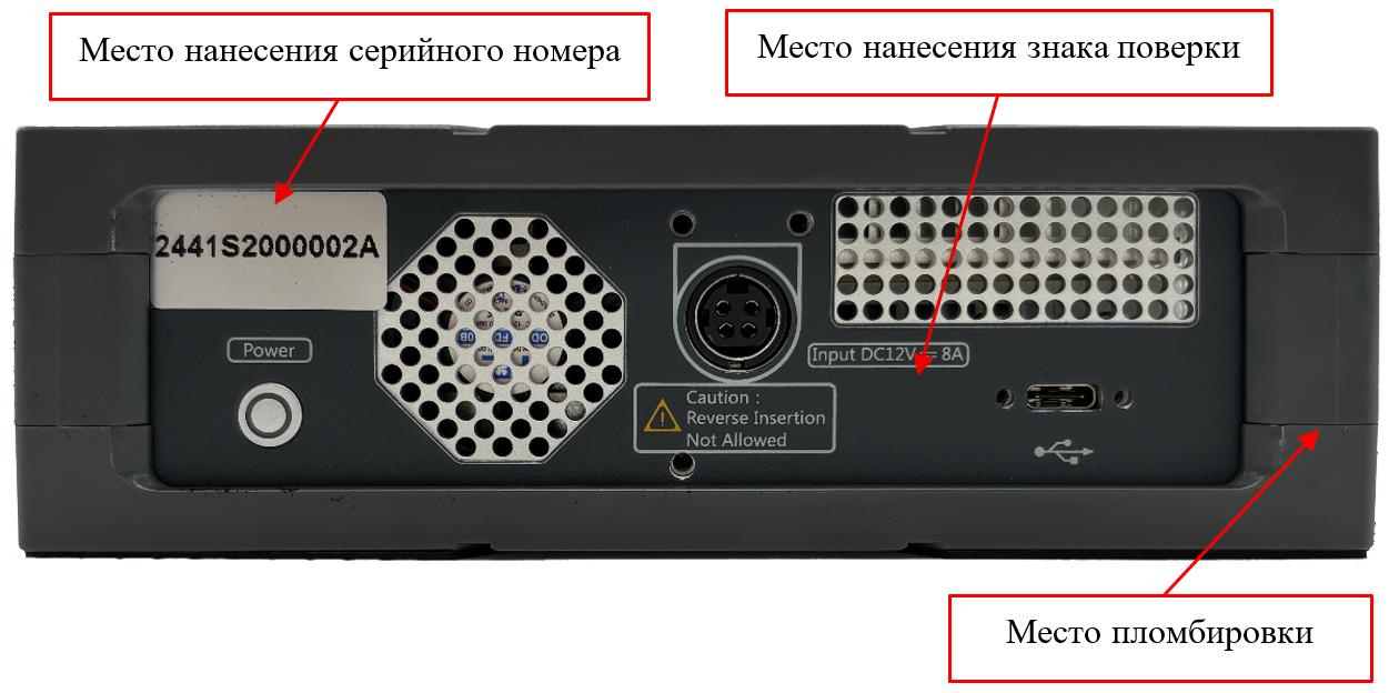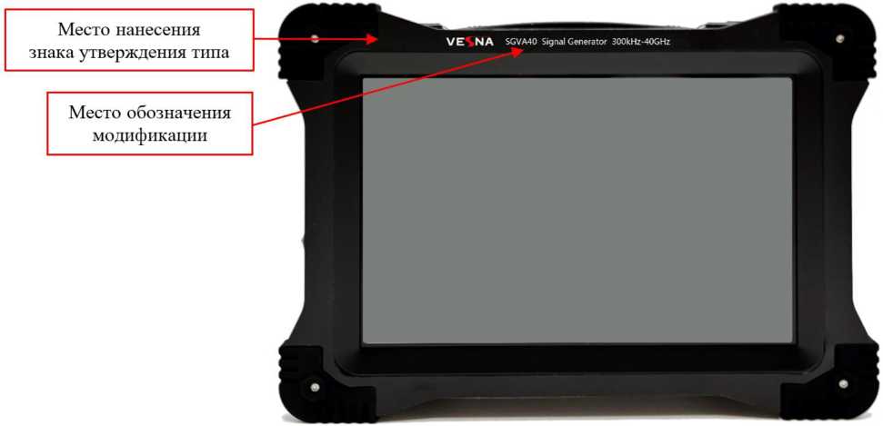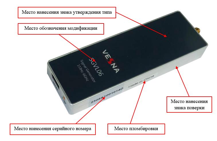 Общий вид генераторов сигналов VESNA SGV c указанием мест нанесения обозначения модификаций, серийного номера, знака утверждения типа СИ, схемы пломбировки от несанкционированного доступа для каждой модификации представлены на рисунках 1 - 5.