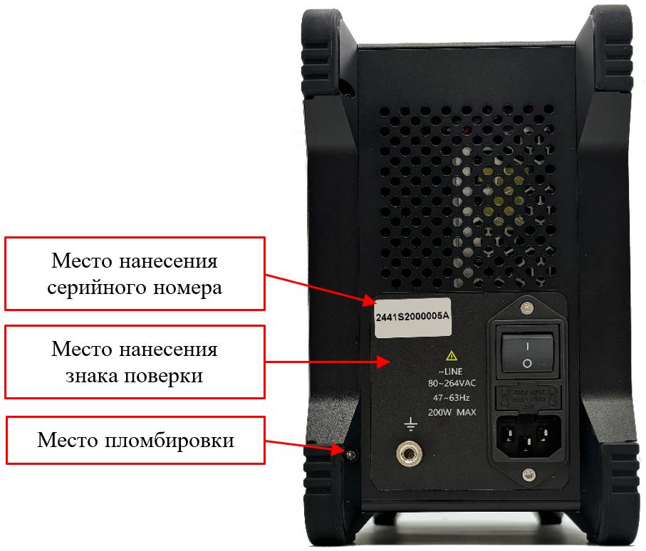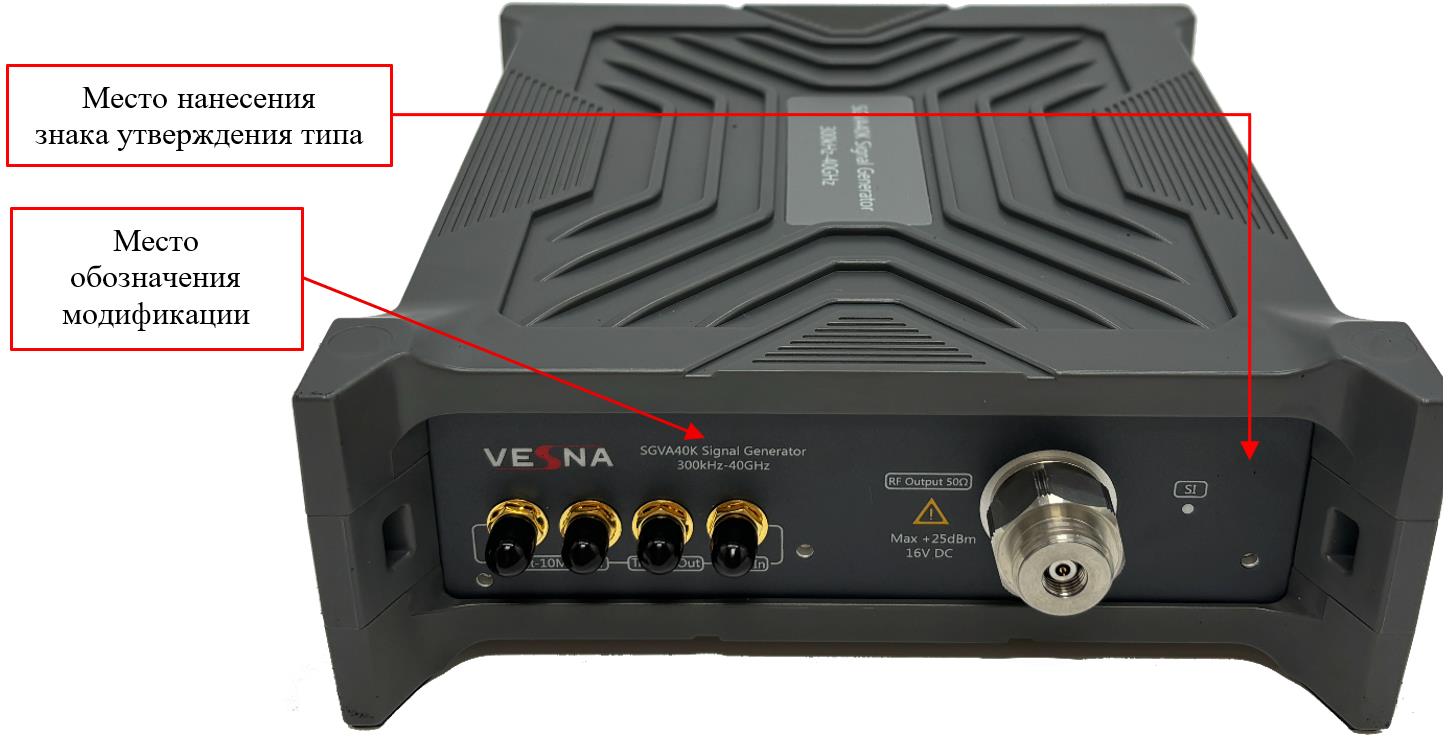 Серийный номер в формате тринадцатизначного буквенно-цифрового обозначения, состоящего из арабских цифр и букв латинского алфавита, идентифицирующий каждый экземпляр средства измерений, напечатанный типографским способом, наносится методом наклейки на задней панели генераторов модификаций VESNA SGVA20K, VESNA SGVA40K или правой панели генераторов модификаций VESNA SGVL06, VESNA SGVA20, VESNA SGVA40.