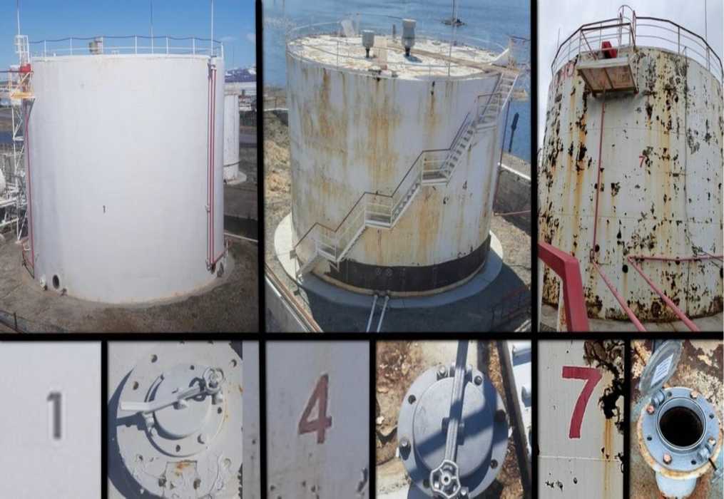 Рисунок 1 - Фотографии общего вида резервуаров стальных вертикальных цилиндрических РВС-1000(№№ 4,7), РВС-2000(№1), их горловин замерного люка и заводских номеров