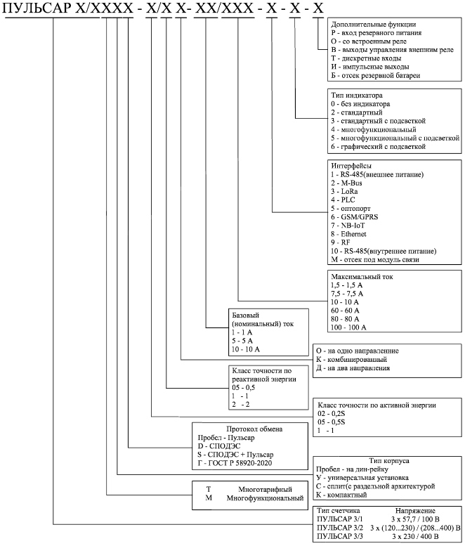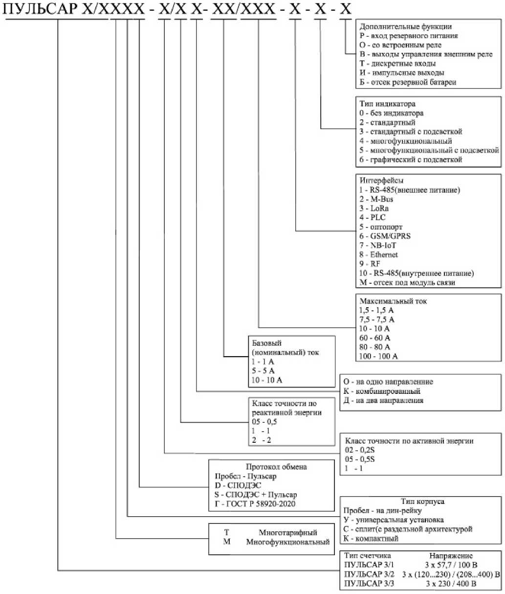ПУЛЬСАР Х1/Х1 Х2Х3Х4 - Х5/Х6 Х7 - ХХ8/ХХХ9 - Х10 - Х11 - Х12, где: ПУЛЬСАР Х1/Х1 - тип счетчика: ПУЛЬСАР 3/1 напряжение 3х57,7 / 100 В; ПУЛЬСАР 3/2 напряжение 3х(120...230)/(208...400) В; ПУЛЬСАР 3/3 напряжение 3х 230/400 В Х2 - счетчик: Т - многотарифный; М - многофункциональный Х3 - тип корпуса: Пробел - на дин-рейку; У - универсальная установка; С - сплит с раздельной архитектурой; К - компактный Х4 - протокол обмена: Пробел - Пульсар; D - СПОДЭС; S - СПОДЭС + Пульсар; Г - ГОСТ Р 58920-2020 Х5 - класс точности по активной энергии: 02 - 0,2S; 05 - 0,5S; 1 - 1 Х6 - класс точности по реактивной энергии: 0,5 - 0,5; 1 - 1; 2 - 2 Х7 - О - на одно направление; К - комбинированный; Д - на два направления ХХ8 - базовый (номинальный) ток: 1 - 1 А; 5 - 5 А; 10 - 10 А ХХХ9 - максимальный ток: 1,5 - 1,5 А; 7,5 - 7,5 А; 10 - 10 А; 60 - 60 А; 80 - 80 А; 100 - 100 А Х10 - интерфейсы: 1 - RS-485(внешнее питание); 2 - M-Bus; 3 - LoRa; 4 - PLC; 5 - оптопорт; 6 - GSM/GPRS; 7 - NB-loT; 8 - Ethernet; 9 - RF; 10 - RS-485(внутреннее питание); М - отсек под модуль связи Х11 - тип индикатора: 0 - без индикатора; 2 - стандартный; 3 - стандартный с подсветкой; 4 - многофункциональный; 5 - многофункциональный с подсветкой; 6 - графический с подсветкой Х12 - дополнительные функции: Р - вход резервного питания; О - со встроенным реле; В - выходы управления внешним реле; Т - дискретные входы; И - импульсные выходы; Б - отсек резервной батареи на испытания представлены: ПУЛЬСАР 3/3МСS-1/2Д-5/100-5,М-0-ОИБ ПУЛЬСАР 3/1MKS-02/05Д-1/1,5-5,10,М-5-И |