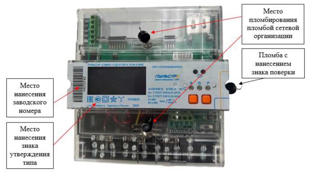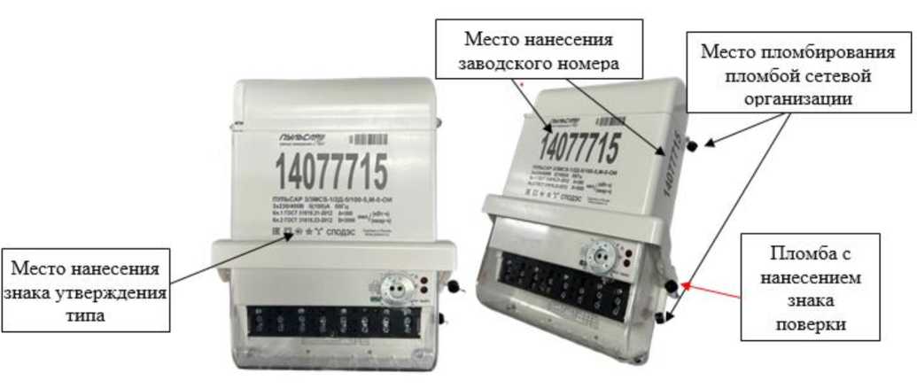 Общий вид счетчиков в корпусе сплит (с раздельной архитектурой) с указанием места ограничения доступа к местам настройки (регулировки), места нанесения знака утверждения типа, места нанесения заводского номера представлен на рисунке 5. Способ ограничения доступа к местам настройки (регулировки) - пломба с нанесением знака поверки.